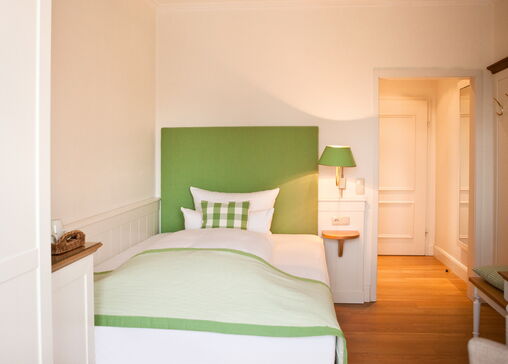 Gemütliches Einzelzimmer im ersten Obergeschoss. Großzügige Sitzecke, Duschbad mit Glasdusche und Fenster.